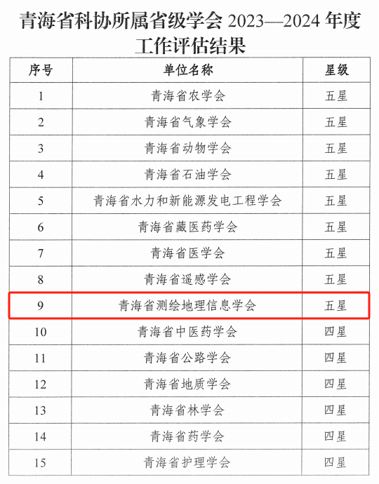 近日,青海省科学技术协会公布了2023-2024 年度所属省级学会工作评估结果,青海省测绘地理信息学会(协会)凭借在学术交流、科普宣传、人才培养等多方面的卓越表现,荣膺五星级称号,这一成绩标志着学会在推动青海测绘地理信息事业发展中发挥了关键引领作用。