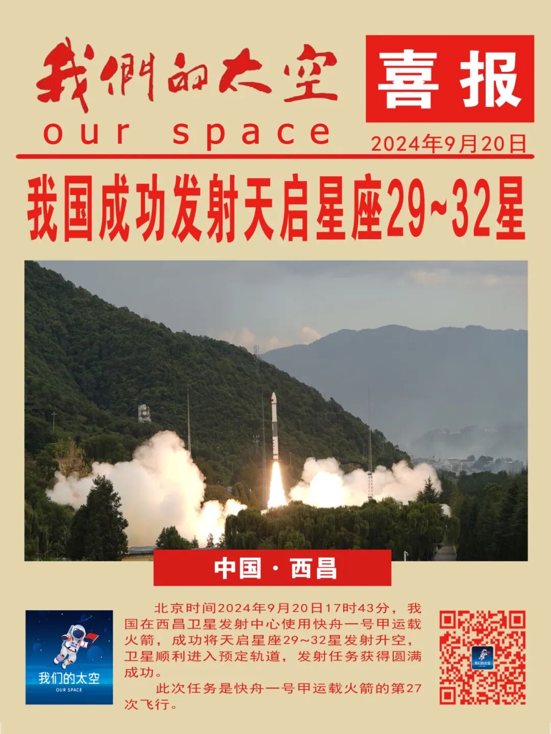 北京时间2024年9月20日17时43分,我国在西昌卫星发射中心使用快舟一号甲运载火箭,成功将北京国电高科科技有限公司(以下简称“国电高科”)自主建设运营的天启星座29-32星发射升空,卫星顺利进入预定轨道,发射任务获得圆满成功。