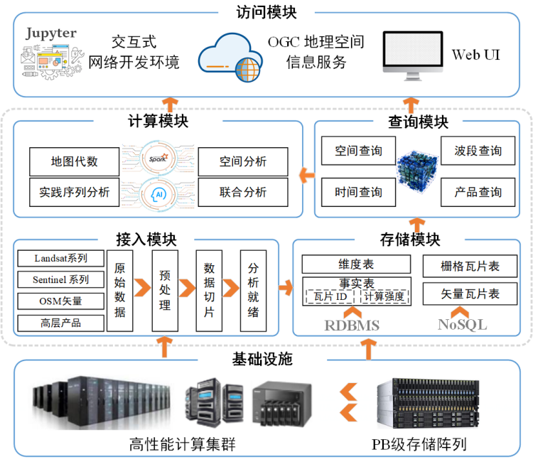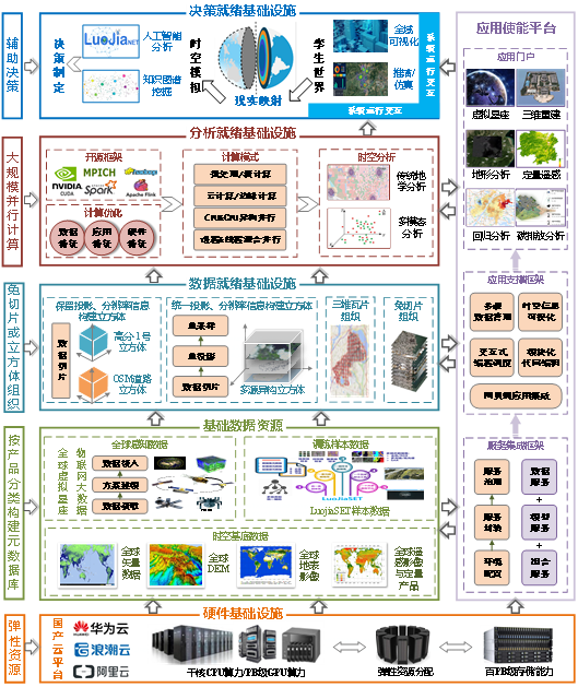 首先提出全球时空大数据的统一组织和管理方法,为全球范围的遥感影像数据、数字高程模型、地物矢量数据、定量遥感产品、遥感解译样本、卫星虚拟星座数据,以及物联网数据等多源、异构、海量感知数据提供统一时空基准与组织模型,基于多元混合存储技术构建全球时空感知数据库,形成数据就绪的时空信息基础设施,从而为孪生地球提供时空感知的统一数据基底。2.分析就绪层