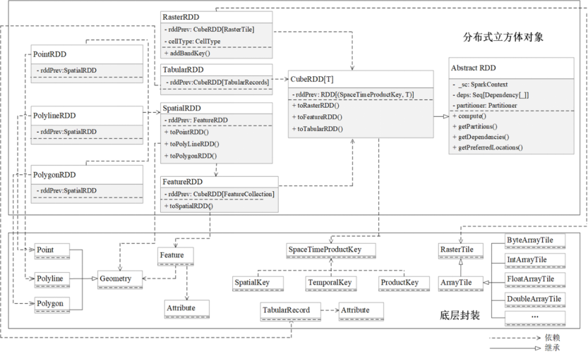 Apache Spark作为主流的分布式计算框架,采用弹性分布式数据集 RDD作为数据容器,是一种专为大规模数据处理而设计的高效计算引擎(Zaharia et al, 2010)。OGE对Spark RDD进行了扩展,提出了一套分布式立方体对象CubeRDD,实现了GeoCube模型到云计算环境的无缝映射,如图4所示。该映射设计一方面可以继承 Spark RDD 分布式计算能力,另一方面可以兼容立方体多源数据类型。CubeRDD 的设计模式便于用户沿着不同维度进行分布式分析:针对RasterRDD,沿着时间维度TimeKey做聚合,可以实现分布式时间序列分析,沿着波段维度BandKey做聚合,可以实现分布式波段融合分析;针对FeatureRDD,沿着产品维度ProductKey做聚合,可以实现两个产品或图层的空间几何分析。此外,矢栅场与专题数据处于统一时空框架中,可以对RasterRDD 和FeatureRDD做连接操作,实现多源数据的联合分析。