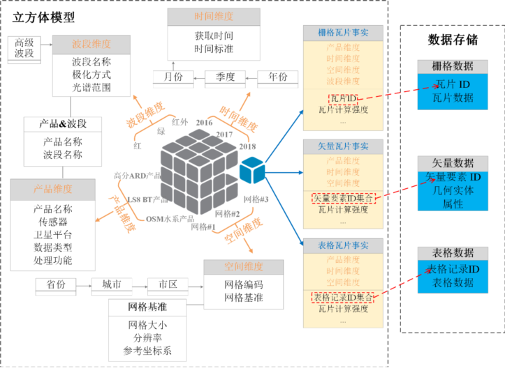 针对矢栅数据的集成管理需求,GeoCube设计了四个立方体维度:时间、空间、产品和波段。时间、空和产品维度是矢量数据和栅格据共有的公维度,波段是栅格数据的独有维度。GeoCube除支持栅格、场和矢量数据外,还扩展支持了表格数据,用以集成带时空属性的专题信息。1. 产品维度