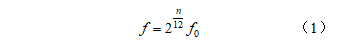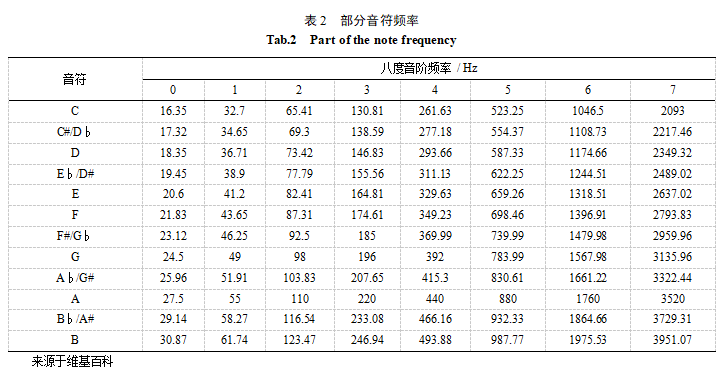 式中,f为频率,Hz;f0为参考频率,通常为国际标准音高A4,即440Hz;为相对于基准音的半音数,如果是升高则为正数,降低则为负数。部分音符频率见表2。