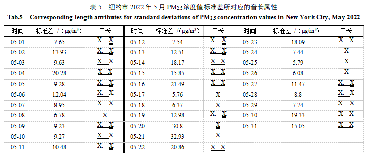 式中,An为分级指标;Tmax、Tmin为PM2.5浓度值标准差的最大值与最小值,μg/m3。经过计算,得到纽约市2022年每一天的PM2.5浓度值标准差所对应的音长属性,其中,2022年5月的数据见表5。
