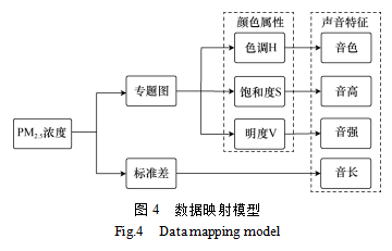 以颜色为主要视觉变量的地图表达,其信息传递主要通过颜色三个基本属性(色相、饱和度和明度)的差异化设置来实现,为了实现信息的可听化,需要提取这三个属性值。因此,分别提取纽约市2022年每一天的PM2.5浓度专题地图H、S、V特征平均值,进而实现地图的颜色分割。同时将时间维度叠加,为后续的时空信息可听化映射模型提供了数据支持。实验选用OpenCV来实现地图的HSV特征提取。时空信息的可听化过程中最主要的部分是建立有效的声音映射模型,声音映射通常采取某些技术或方法将某种信息或数据映射到声音维度,以便用户通过听觉方式来感知和理解这些信息(郝宇,2010)。耳标是一种以声音的形式传递信息的符号系统,通常是一段简短的音频片段,它们可以用于提供反馈、警告、通知和其他信息,以增强用户界面的交互性和可用性(李黎萍等,2011)。耳标参数包括音色、音高、音强及音长四部分(Blattner等,1989)。其决定了声音的质性差异,建立颜色三属性与耳标四参数之间的映射关系可以实现时空信息的可听化。因此,本文将颜色参数H、S、V与音色、音高、音强关联,为体现空间异质性,将PM2.5浓度值的标准差与音长关联。实验构建的映射模型如图4所示。