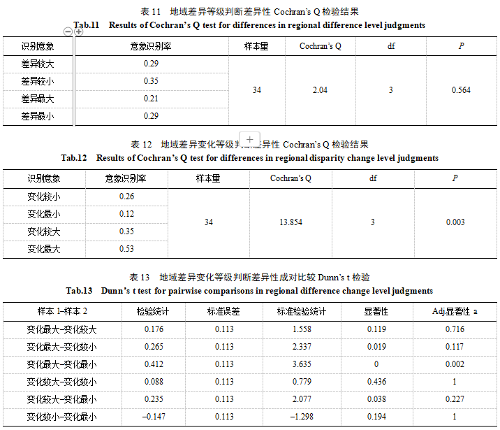 Cochran’s Q检验的结果(表11)显示,辨别污染地域差异显著性P值为0.564>5%,说明被试者对于使用音长表达污染地域差异的辨别总体上不存在显著差异性。Cochran’s Q检验的结果(表12)显示,辨别污染地域差异变化显著性P值为0.003<1%,说明数据总体存在显著差异性。经Bonferroni法校正的Dunn’s t检验结果(表13)显示,被试者辨识污染地域差异变化最大与变化最小存在显著差异性。变化最大的识别率大于变化最小的识别率,说明被试者对音长表达污染地域差异变化时,对变化最大的辨别要显著好于变化最小的辨别。