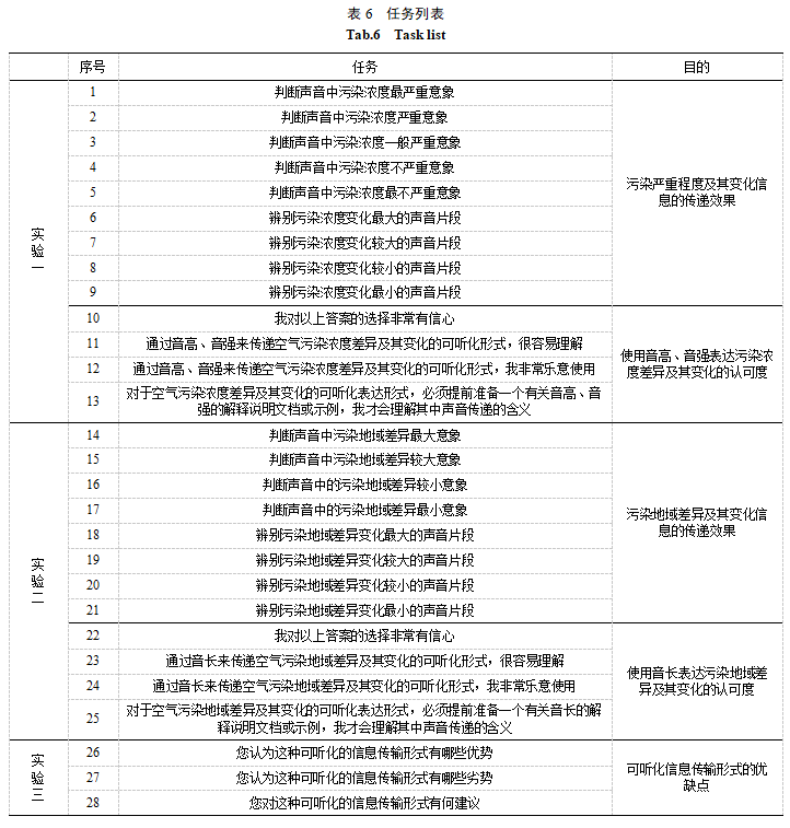 声音具有良好的操纵性,可以方便地进行数字信号处理和组合。然而,声音也具有抽象性的特点,导致需要经过一定时间的学习才能识别和记忆耳标所要表达的信息。从被试者对可听化信息传输形式的优缺点及建议反馈(任务26~28)可知,这种可听化形式,与传统地图可视化形式相比具有独特之处,但对传递的信息理解存在一定挑战。根据表14,从污染浓度的意象识别率平均值可知,被试者对音高、音强传递信息的理解较好;从地域差异及地域差异变化的意象识别率平均值可知,被试者对音长传递信息的理解较差。另外,被试者也提出了增强音乐层次变化、融合图像表达及借鉴各类音乐类型创作等建议。4 结 论