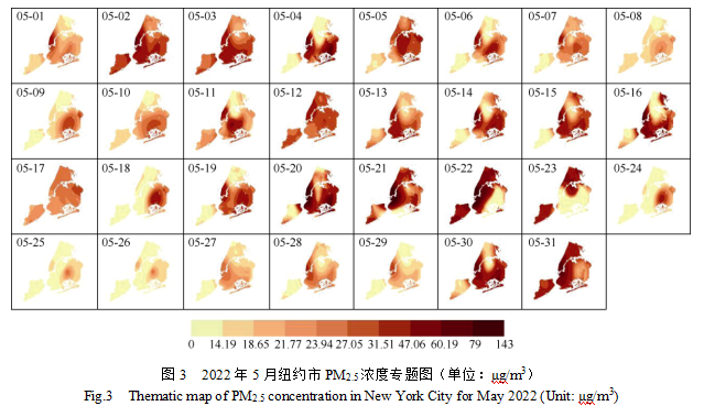 使用以上配色标准,为2022年的每一天制作出具有相同图例标准的PM2.5浓度专题地图,其中, 5月PM2.5浓度专题图如图3所示。可以看出,5月纽约市PM2.5污染中心总体上呈现由中部地区向东部地区,再向西部地区变化的趋势。
