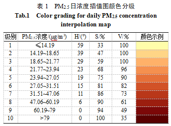 本文采用常用于点数据插值的通用克里金法,将离散的监测点数据转换为连续曲面(陈子轩和何丹,2022;张菲凡等,2022);使用ArcGIS生成以颜色为主要视觉变量的PM2.5浓度地图,根据一年中PM2.5浓度的范围采用自然断点法分级。为体现数据差异性和在其他领域应用的泛化性,实验未参考《环境空气质量指数(AQI)技术规定(试行)》(HJ 633—2012)对空气质量指数级别划分的规定,而是将颜色重新划分为10个等级,然后使用分层设色法将不同等级的浓度值用不同的颜色表示,见表1。