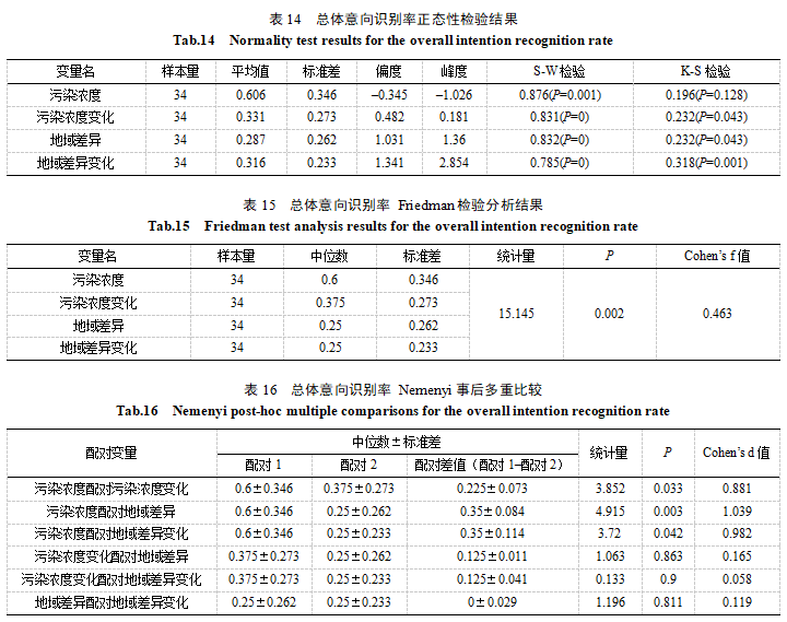 对污染浓度、污染浓度变化、污染地域差异和污染地域差异变化的总体意向识别率进行了差异性分析。由表14可知,样本N5000,采用S-W检验,数据呈现显著性,不满足正态分布,可以进行Friedman检验。通过Friedman检验分析结果(表15)可知,显著性P值为0.002,说明被试者通过以上可听化形式对污染浓度、污染浓度变化、污染地域差异、污染地域差异变化的辨识结果存在显著差异;其差异幅度Cohen’s f值为0.463,差异程度大。事后多重比较采用Nemenyi两两比较差异性,由表16可知,污染浓度与污染浓度变化、污染地域差异、污染地域差异变化之间的辨识结果均存在显著性差异,且配对差值均大于0,说明污染严重程度的识别率大于污染浓度变化、污染地域差异、污染地域差异变化的识别率,结合上文所述各项意向识别率可知,使用音强和音高传递污染浓度的信息效果最佳。