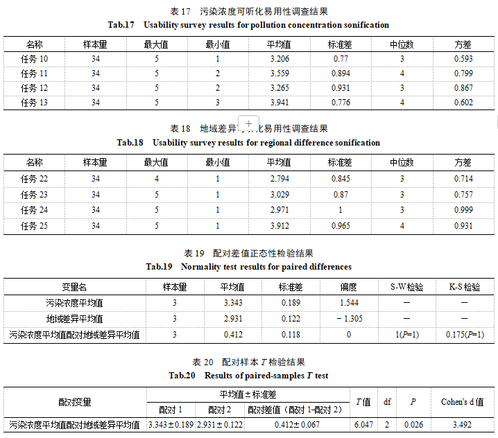 通常采用五分李克特量表调查用户对于使用音高、音强和音长表达污染的认可度(Joshi等,2015)。描述性指标分析见表17~18,这些分数的中位数为3或4,表明大多数被试者对于使用音高、音强和音长来表达污染情况持中立到同意的态度。但被试者对于任务13、25的测试平均值均达到了3.9,说明仍然需要说明文档或示例来帮助被试者理解可听化的含义。对任务10~12和任务22~24进行差异性分析。由表19可知,样本N5000,采用S-W检验,显著性P值为1,水平上不呈现显著性,因此数据满足正态分布,可以进行配对样本T检验。配对样本T检验的结果(表20)显示,基于变量污染浓度平均值配对地域差异平均值,显著性P值为0.026,水平上呈现显著性,因此说明污染浓度平均值与对地域差异平均值之间存在显著性差异。其差异幅度Cohen’s d值为3.492,差异幅度非常大;且配对差值大于0,污染浓度平均值大于地域差异平均值,说明被试者对使用音高、音强表达污染浓度信息的认可度更高。