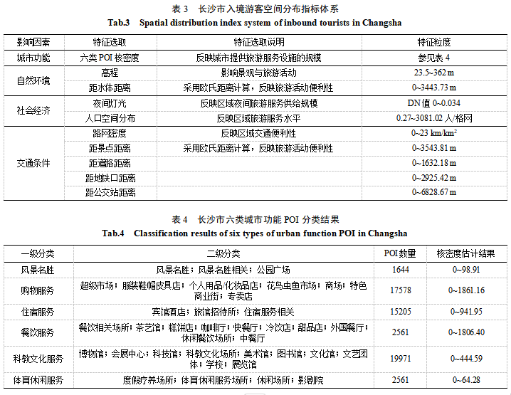 摘 要:当前游客热点识别方法主要依赖于游客的位置信息数据,未充分考虑地理因素对游客活动的影响,在地理意义上的解释力尚有不足。本文基于Flickr平台获取的带有地理标记的照片及其属性信息,结合多源时空数据,使用随机森林算法识别入境游客旅游热点区域(area of interest,AOI),探究长沙市入境游客AOI特征及成因;并与传统的密度聚类算法(P-DBSCAN)进行对比评价。结果表明:①随机森林算法在区域整体热度识别中表现优异,部分AOI边界具有明确的地理意义;②入境游客的整体分布格局较为稳定,核心区外围受距离影响明显,发展潜力不足,距景点400 m处为影响入境游客分布的临界点。本文为研究长沙市及类似城市的入境旅游热点区域和旅游资源配置提供了新视角。