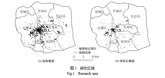 长沙市作为湖南省的省会城市,是湖南省的政治、经济和文化中心,也是历史文化名城和国内热门旅游城市。对长沙市开展入境旅游研究,对于加快推进“十四五”时期旅游业高质量发展,构建长沙国际旅游中心城市具有较强的现实意义。由于地理标记照片集中分布于主城区和长沙黄花国际机场,且主城区内游客数量与长沙市游客数量基本一致,因此,参考杨友宝等(2022),实验以长沙市绕城高速内的主城区为研究区域(图1)。