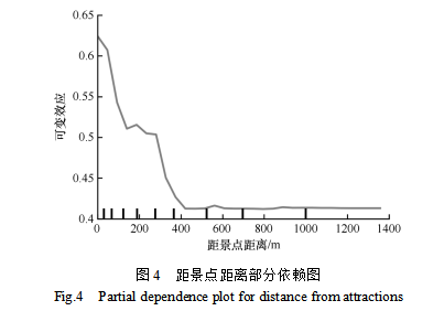 在影响因素占比较大的指标中,定量分析游客分布与距景点距离的边际影响和阈值效应更具现实意义,距景点距离的部分依赖图(partial dependence plot,PDP)如图4所示,随着距离增加,曲线不断下降。在150~270 m处出现波动,随后继续下降,400 m左右后保持稳定。这表明,距景点400 m处为影响入境游客分布的临界点,景点的辐射效应随着距离的增加而逐渐减弱,超过这一距离后,景点的辐射效应逐步消失。