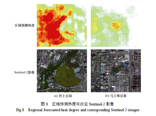 (4)开福区。热点区域分布在南部,天心区、芙蓉区和湘江交界处,包括长沙音乐厅、开福寺、湖南博物院及其东侧的烈士公园。东南部世界之窗、湖南广播电视台,长沙国际会展中心附近也为高热度区。实验还发现,在烈士公园内,30 m的栅格预测结果能够区分小岛、河堤、桥与水体,提高栅格分辨率有助于细分热点区域,如图8(a)所示。