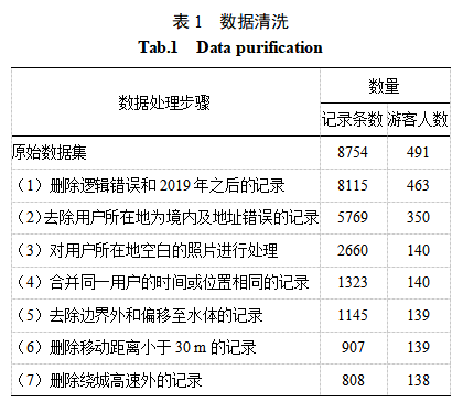过半数据的用户所在地为空白,通过用户ID和照片ID访问用户主页,查询了用户在境内的时间点前一个月内所有的位置信息,如果包括境外,则将用户视为入境游客。为了消除同一用户连续拍摄多张照片的影响,有研究采用空间过滤的方法(Hu 等,2015)。但这种方法对于数据的去除具有随机性,破坏了游客移动的轨迹信息,因此本文采用间隔取点法进行处理,对于用户移动距离小于30m的点进行删除,保留首尾点。